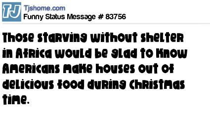 X says Those starving without shelter in Africa would be glad to know Americans make houses out of delicious food during Christmas time.