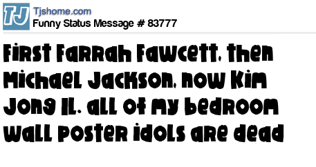 - # 83775 first it was Farrah Fawcett, then Michael Jackson, now Kim Jong Il. all of my bedroom wall poster idols are dead