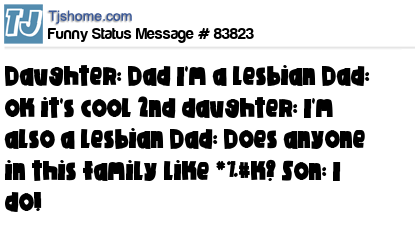 - # 121402 Daughter: dad I'm a lesbian Dad: Okay its cool 2nd daughter: dad I'm a lesbian too Dad: Does ANYone in this family like guys? Son: I do