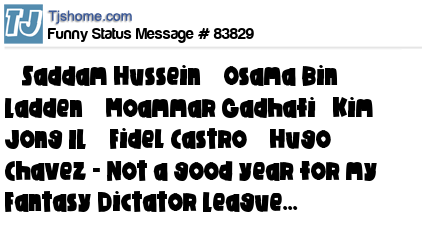 - # 125420 Reports are in that Hugo Chjavez has died....hmmmmm β Saddam Hussein β Osama Bin Ladden β Moammar Gadhafi βKim Jong IL βFidel Castro βHugo Chavez - Not good timesr for my Fantasy Dictator League...