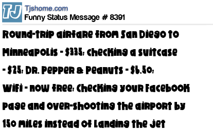 X is Round-trip airfare from San Diego to Minneapolis - $335; checking a suitcase - $25; Dr. Pepper & Peanuts - $6.50; WiFi - now free; Checking your Facebook page and over-shooting the airport by 150 miles instead of landing the jet airliner - JOBLESS !!!
