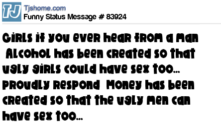 X  Girls if you ever hear from a man “Alcohol has been created so that ugly girls could have sex too…” proudly respond “Money has been created so that the ugly men can have sex too…”