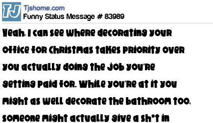 X is Yeah, I can see where decorating your office for Christmas takes priority over you actually doing the job you're getting paid for. While you're at it you might as well decorate the bathroom too, someone might actually give a sh*t in there