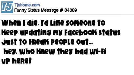 - # 84098 When I die, I'd like someone to keep updating my Facebook status just to freak people out… “hey, who knew they had wi-fi Down there?”