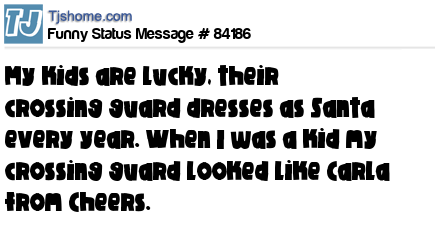 X says My kids are lucky, their crossing guard dresses as Santa every year. When I was a kid my crossing guard looked like Carla from Cheers.