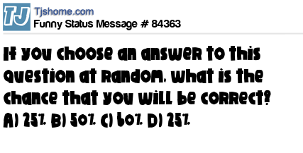 X If you choose an answer to this question at random, what is the chance that you will be correct? A) 25% B) 50% C) 60% D) 25%