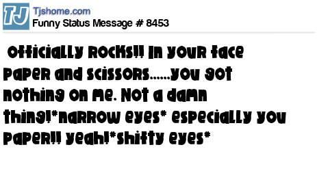 X officially rocks!! In your face paper and scissors......you got nothing on me. Not a damn thing!*narrow eyes* especially you paper!! yeah!*shifty eyes*