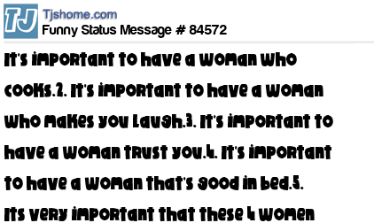 X is It's important to have a woman who cooks.2. It's important to have a woman who makes you laugh.3. It's important to have a woman trust you.4. It's important to have a woman that's good in bed.5. Its very important that these 4 women don't know each ot