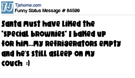 X is Santa must have liked the "special brownies" I baked up for him...my refrigerators empty and he's still asleep on my couch  :)