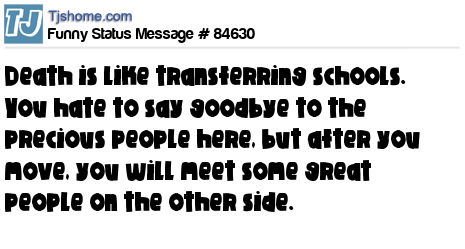 X  Death is like transferring schools. You hate to say goodbye to the precious people here, but after you move, you will meet some great people on the other side.