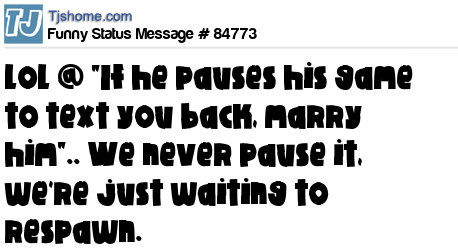 X says lol @ "If he pauses his game to text you back, marry him".. We never pause it, we're just waiting to respawn.