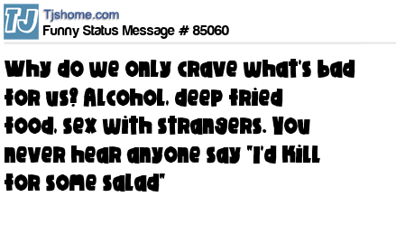- # 161483 Why do we only crave what's bad for us? Alcohol, deep fried food, cake... You never hear anyone say "I'd kill for some salad."