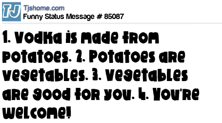 X 1. Vodka is made from potatoes. 2. Potatoes are vegetables. 3. Vegetables are good for you. 4. You're welcome!
