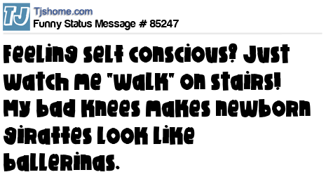 X is Feeling self conscious? Just watch me "walk" on stairs! My bad knees makes newborn giraffes look like ballerinas.