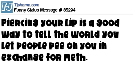 X Piercing your lip is a good way to tell the world you let people pee on you in exchange for meth.