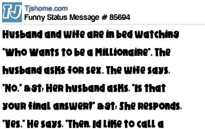 - # 182744 Husband and wife are in bed watching "Who Wants to be a Millionaire". The husband asks for sex. The wife says, "No." Her husband asks, "Is that your final answer?" She responds, "Yes." He says, "Then, Id like to phone a friend."