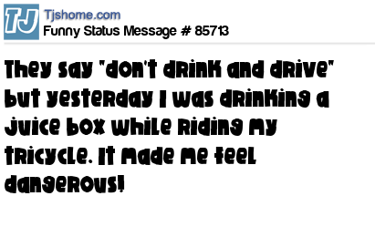 - # 25293 They say "don't drink and drive" but yesterday I was drinking a juice box while on my tricycle. It made me feel dangerous!