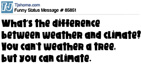 - # 120628 The meteorologist on the news gives the forecast then says, "People don't know the difference between weather and climate." Yes I do: "Oh look, a ladder I don't know weather I should walk under it or climate." See? Told you.