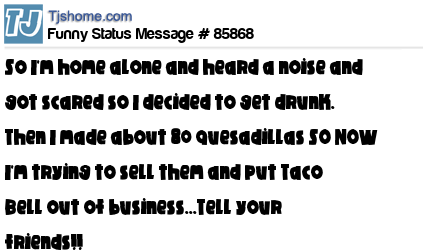 X says So I'm home alone and heard a noise and got scared so I decided to get drunk. Then I made about 80 quesadillas SO NOW I'm trying to sell them and put Taco Bell out of business...Tell your friends!!