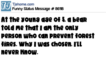 - # 94851 One time when I was 8 years old, a bear wearing a hat came up to me in the woods and told me ONLY I could prevent forest fires. Why he chose me, I will never know.