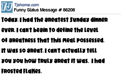 X Today, I had the greatest Sunday dinner ever. I can't begin to define the level of greatness that this meal possessed. It was so great, I can't actually tell you you how truly great it was. I had Frosted Flakes.