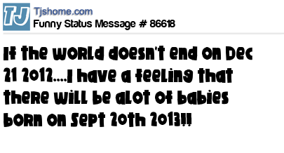 - # 70222 The Mayan Calendar says the world will end on Dec 21, 2012, which really means a lot of babies will be born on Sept 21, 2013.