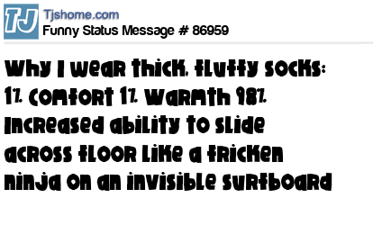 X Why I wear thick, fluffy socks: 1% Comfort 1% Warmth 98% Increased ability to slide across floor like a fricken ninja on an invisible surfboard
