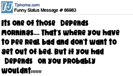 X is Its one of those «Depends» mornings.... That's where you have to pee real bad and don't want to get out of bed. But if you had «Depends» on you probably wouldnt;;;;;;;