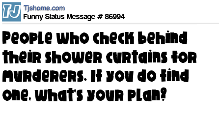 - # 208677 Dear paranoid people who check behind the shower curtain for murderers: What exactly is the plan if you find one?