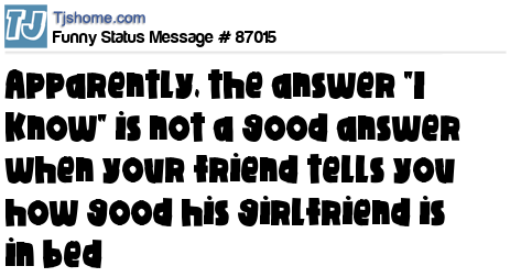 X Apparently, the answer "I Know" is not a good answer when your friend tells you how good his girlfriend is in bed