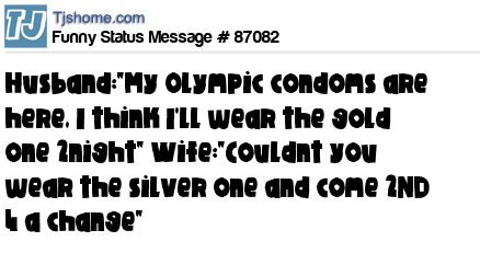 X Husband:"My Olympic condoms are here, I think I'll wear the gold one 2night" Wife:"Couldnt you wear the silver one and come 2ND 4 a change"