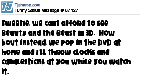 X Sweetie, we cant afford to see Beauty and the Beast in 3D. How bout instead, we pop in the DVD at home and I'll throw clocks and candlesticks at you while you watch it.