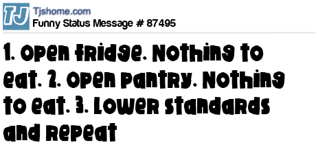 X 1. Open fridge. Nothing to eat. 2. Open pantry. Nothing to eat. 3. Lower standards and repeat