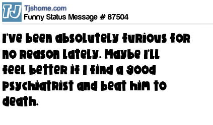 X is I've been absolutely furious for no reason lately. Maybe I'll feel better if I find a good psychiatrist and beat him to death.