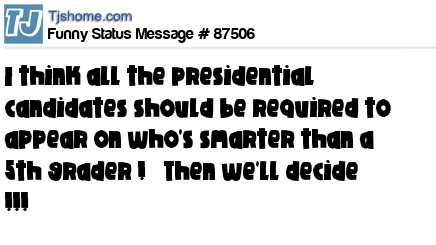 - # 114923 Instead of 3 debates, the presidential candidates should be on Jeopardy, Are you smarter than a 3rd grader, and American Gladiators to determine who gets my vote.