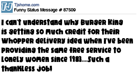 X is I can't understand why Burger King is getting so much credit for their Whopper delivery idea when I've been providing the same free service to lonely women since 1983....Such a thankless job! ツ