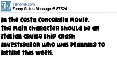 - # 87464 The captain of the Costa Concordia is maintaining he only abandoned ship before the passengers because he tripped and fell in to a life boat. I find this very feasible as I once accidently tripped and my pen!s fell in to my wife's sister.