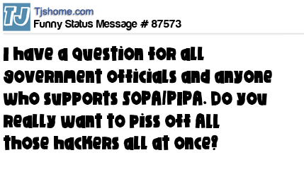 X says I have a question for all government officials and anyone who supports SOPA/PIPA. Do you really want to piss off ALL those hackers all at once?
