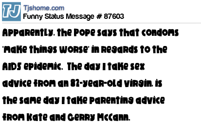 X is Apparently, the Pope says that condoms 'make things worse' in regards to the AIDS epidemic. The day I take sex advice from an 82-year-old virgin, is the same day I take parenting advice from Kate and Gerry McCann.