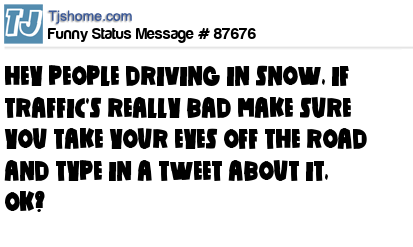 X HEY PEOPLE DRIVING IN SNOW, IF TRAFFIC'S REALLY BAD MAKE SURE YOU TAKE YOUR EYES OFF THE ROAD AND TYPE IN A TWEET ABOUT IT, OK?
