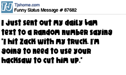 X  I just sent out my daily 6am text to a random number saying "I hit Zack with my truck. I'm going to need to use your hacksaw to cut him up."
