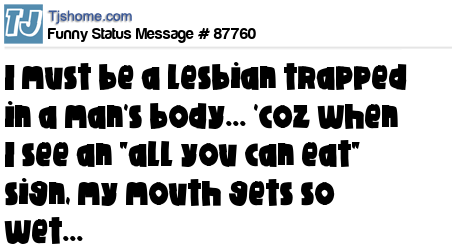 X is I must be a lesbian trapped in a man's body... 'coz when I see an "all you can eat" sign, my mouth gets so wet...