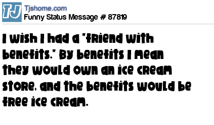 - # 34547 I wish I had a "friend with benefits." But the friend would own an ice cream store, and the benefits would be free ice cream.