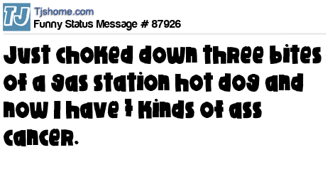 X  Just choked down three bites of a gas station hot dog and now I have 7 kinds of ass cancer.