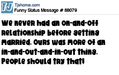 X  We never had an on-and-off relationship before getting married. Ours was more of an in-and-out-and-in-out thing. People should try that!