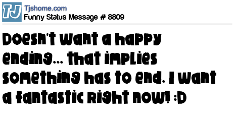 - # 5476 I don't want a happy ending... that implies something has to end..I want a fantastic right now! !! Oh, but wait. I've heard happy endings can be good!! I need to check into that!