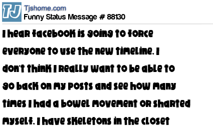 X  I hear facebook is going to force everyone to use the new timeline. I don't think I really want to be able to go back on my posts and see how many times I had a bowel movement or sharted myself. I have skeletons in the closet to clean out!!