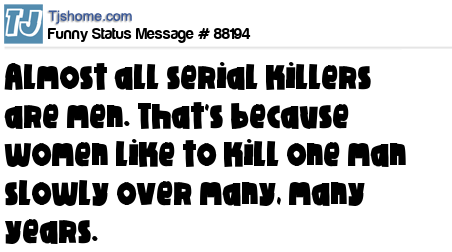 X says Almost all serial killers are men. That's because women like to kill one man slowly over many, many years.