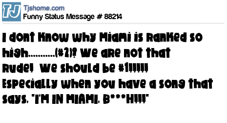 X  I dont know why Miami is ranked so high...........(#2)? We are not that rude!  We should be #1!!!!!  Especially when you have a song that says, "I'M IN MIAMI, B***H!!!"