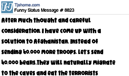 X says After much thought and careful consideration, I have come up with a solution to Afghanistan. Instead of sending 40,000 more troops, let's send 40,000 bears.They will naturally migrate to the caves and eat the terrorists hiding out there.Problem Solved!